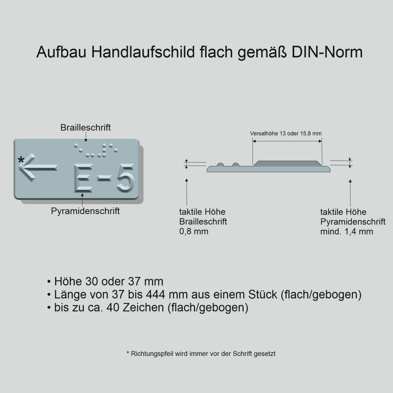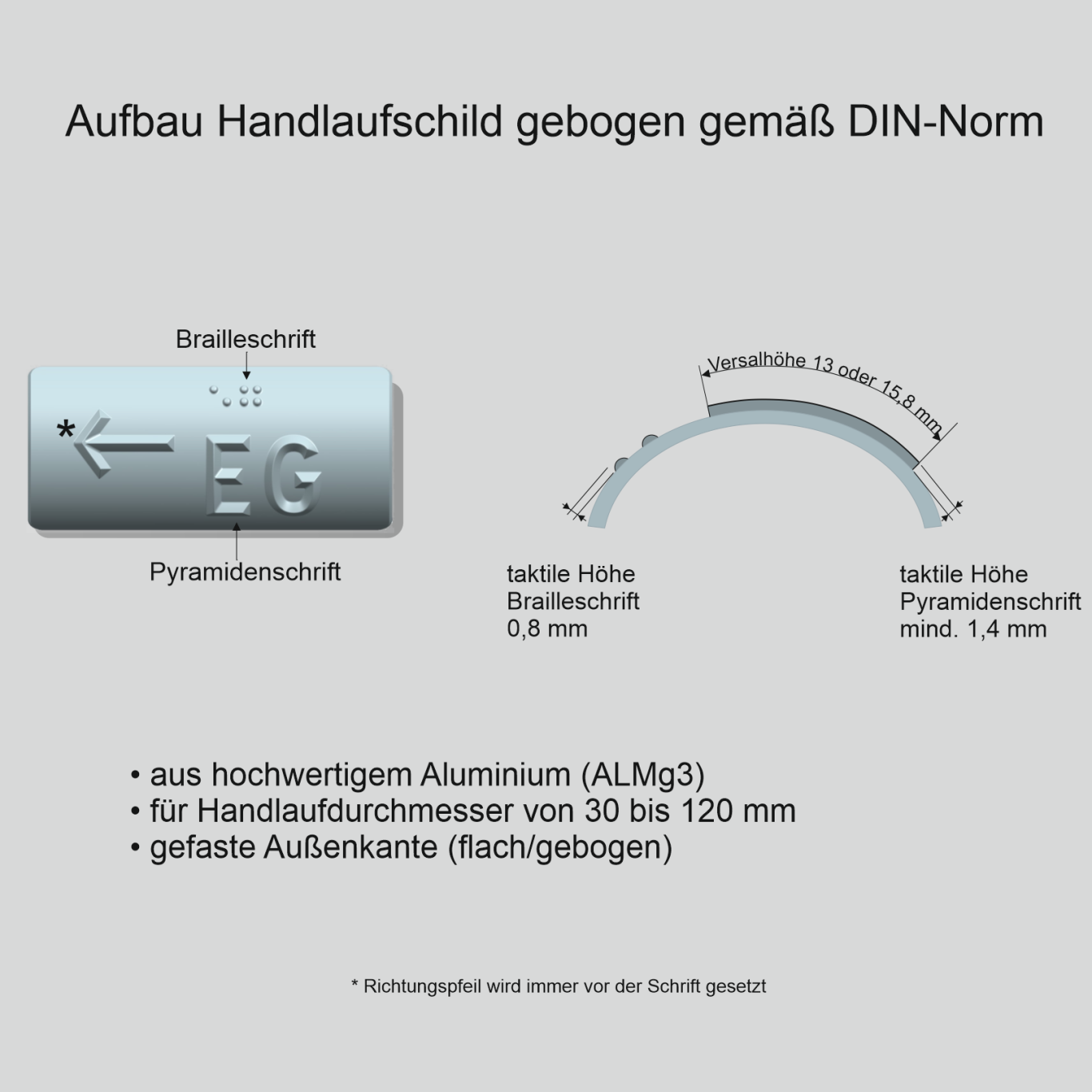 Gefertigt nach DIN 32986, mit erhabener Pyramiden/ Profilschrift und Brailleschrift, passend für runde und flache Handläufe.